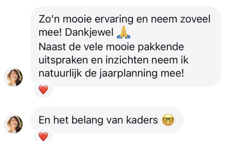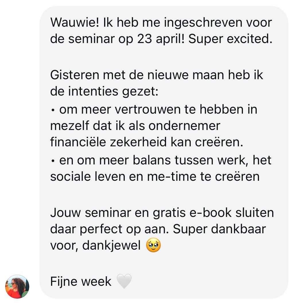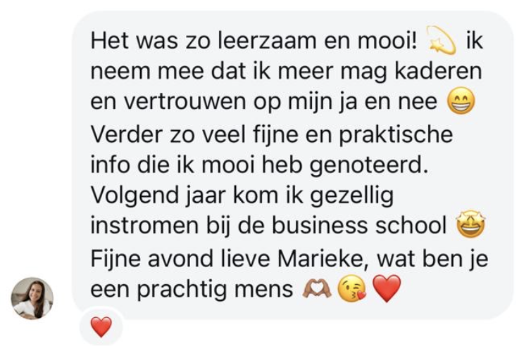 Marieke leest dit en verwerkt jouw situatie in het seminar → jouw persoonlijke businessadvies, helemaal op maat.