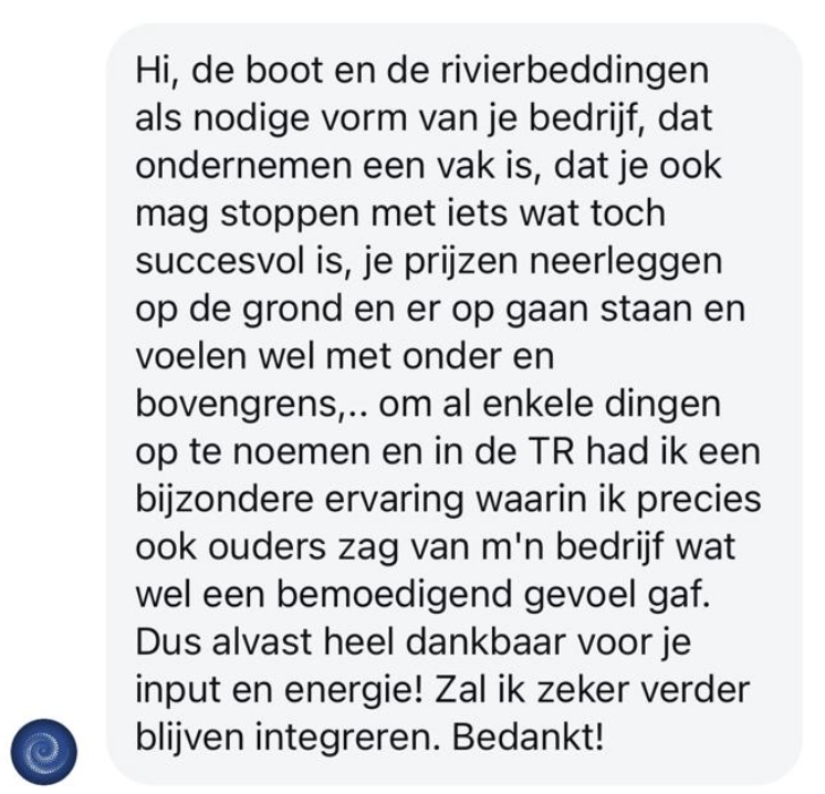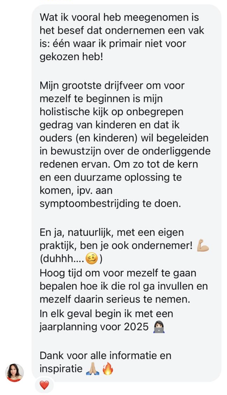 “Waar ik me bij andere marketing cursussen e.d. niet volledig begrepen voelde m.b.t. ‘ik ben hier met een zielsmissie – mijn keuze was niet direct om ondernemer te willen zijn’ heb ik dit hier wel kunnen vinden, horen en voelen.”